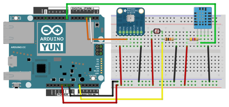 For this project, you will of course need the Arduino Yun board. You will also need a DHT11 (or DHT22) sensor, along with a 4.7K resistor, for humidity measurements. For pressure & temperature measurements, I used a BMP085 sensor on a simple breakout board, but you can also use the newer Adafruit BMP180 sensor board, which works with the same library. For light levels measurements, I used a photocell with a 10K Ohm resistor. Finally, I used a breadboard and some male-male jumper wires.