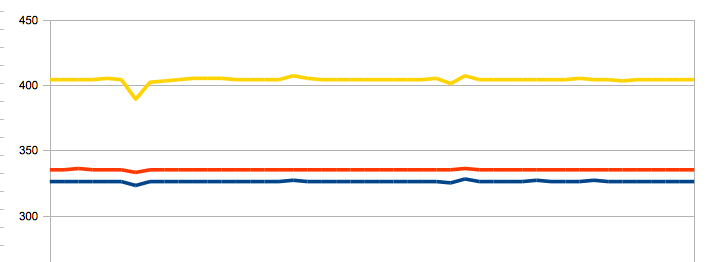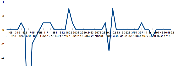 After the massaging the data in a spreadsheet I could graph the results for the most intense period of activity (about 5 seconds) in all their less than awesome glory: