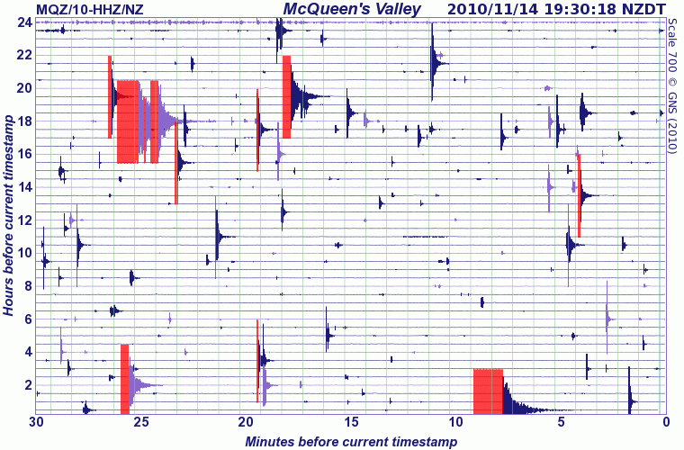 Following the main earthquake and aftershocks, GeoNet became a popular destination to find out the magnitude of events and view the images generated from the Seismograph Drums. This is one of the images generated from data recorded from one seismograph drum during the magnitude 4.7 and 4.9 earthquakes I describe later in this post: