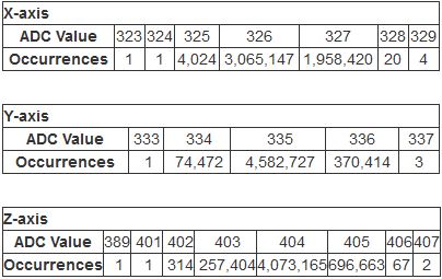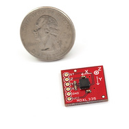 When deciding on the accelerometer to use I had the choice of an ADXL335 or an ADXL345. I decided to start with the ADXL335 because it's an analog device which means it's easier to hook up and get started with. (The ADXL345 uses SPI or I2C digital signals to communicate and because it's a 3.3V device I'd need to use some form of level conversion to hook it up.) While the ADXL335 can also be powered with 3.3V we only receive information from it so we do not need level conversion. We do, however, need to take this lower maximum voltage into account when interpreting the values received. (You may well think I'm making specific note of this because I forgot to take this into account until I started writing this post, but I couldn't possibly comment.)