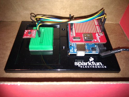 The MicroSD shield provided an easy way to record the data as I had already written a simplified wrapper library for the great sdfatlib library for another project. A slightly modified version of this wrapper library will soon be available as the SD library in the next Arduino release. After modifying a few lines of the original code it was now writing the accelerometer readings to a MicroSD card.