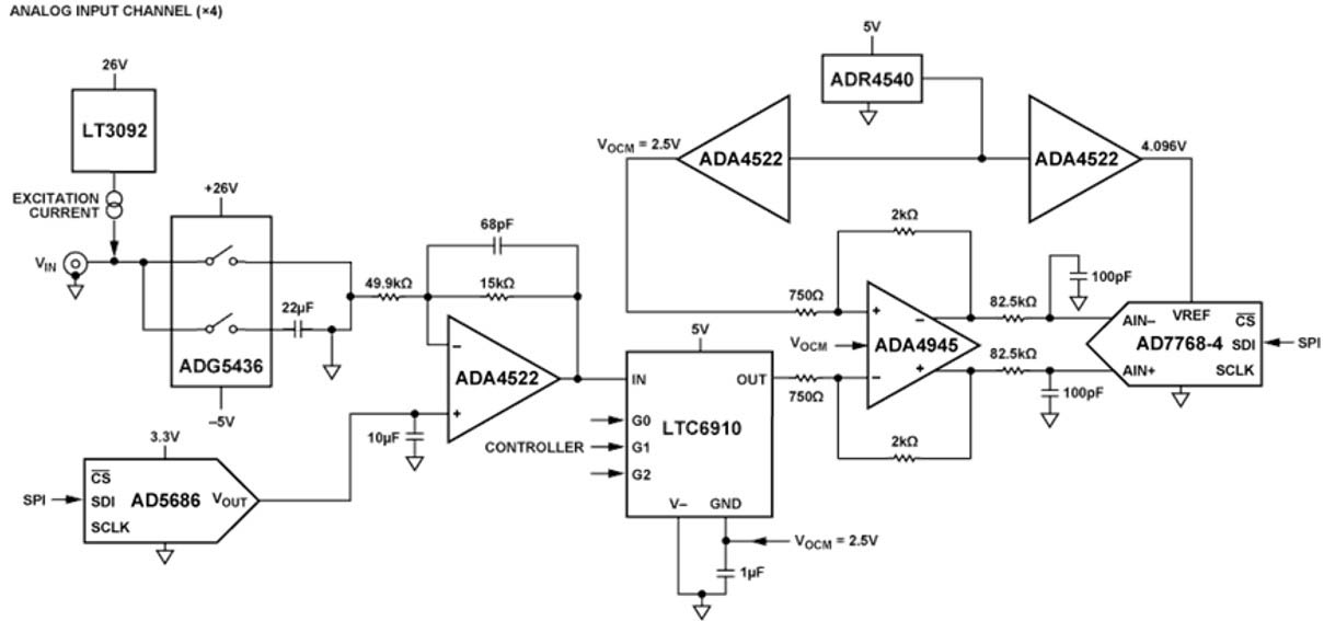 ADI's CN0582 is a self-contained, USB-based, quad-input channel integrated electronics piezoelectric (IEPE) data acquisition system used in a wide array of condition-based monitoring (CbM), building monitoring, and structural analysis applications. Coupled with an on-board direct digital synthesis (DDS) signal generator for shaker table excitation, this solution allows sensor testing and data analysis on a single platform while controlled by a single application programming interface (API).