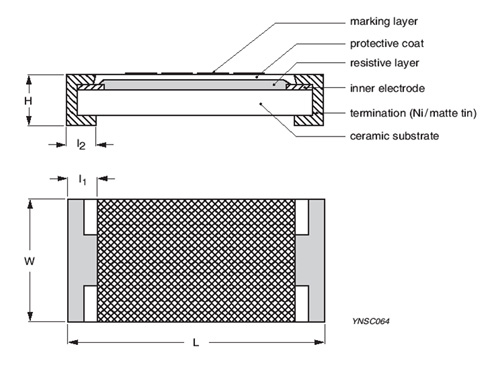 YAGEO RT series is manufactured using an established thin-film technology in which conductive films are deposited on a ceramic substrate by sputtering. Product sizes range from 0201 to 2512 and resistance values range from 10 Ω to 332 kΩ. They also have the intrinsic benefits of thin-film technology including narrow tolerance values down to 0.05%, low, stable temperature coefficients down to 10 ppm/°C, and excellent high-frequency performance. The superior characteristics of thin-film resistors make them ideal for a host of modern applications that demand precision and excellent high-frequency behavior. YAGEO RT Series Diagram