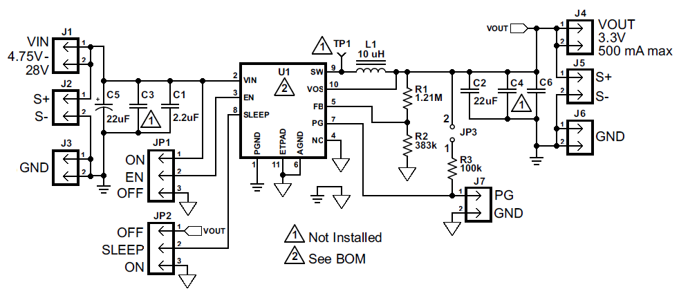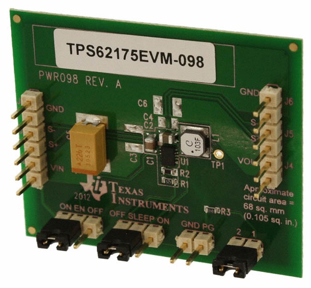 The TPS62175EVM-098 (PWR098-001) uses the TPS62175 adjustable version and is set to a 3.3 V output. The EVM operates with full-rated performance with an input voltage between 4.75 V and 28 V.