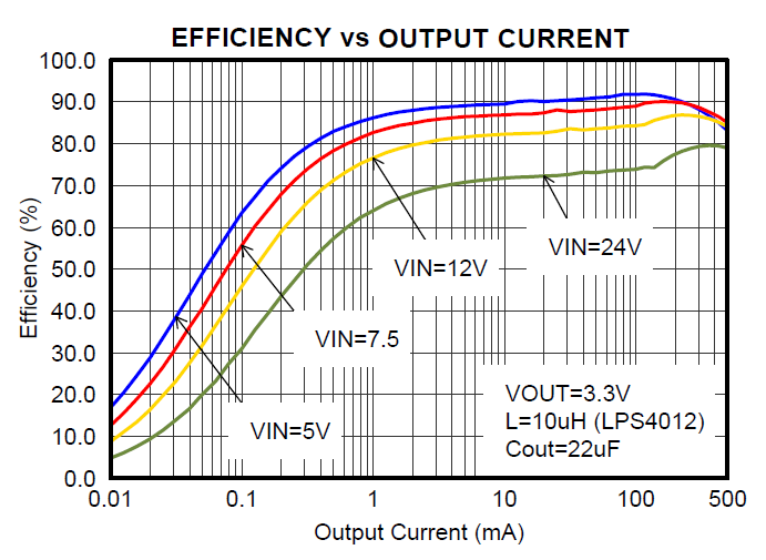 >80%, 5V in, 3.3V @ 0.35 ~ 500 mA >80%, 12V in, 3.3V @ 2 ~ 500 mA >70%, 24V in, 3.3V @ 3 ~ 500 mA |
