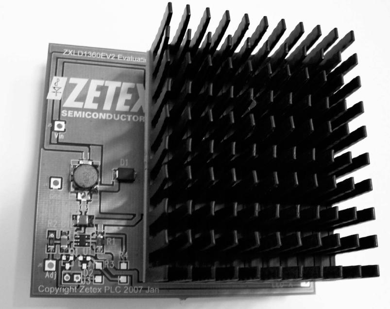 The ZXLD1360EV2, Figure 1, is an evaluation board for evaluating the ZXLD1360 1000mA LED driver with internal switch. The evaluation board can be used to drive a 1 amp LED, or an external choice of LEDs. The number of external connected LEDs depends on the forward voltage of the LEDs connected. A 6 way connector is provided, to allow an external 0.1 inch connecter to be inserted. The LED fitted on this evaluation board is the Ostar range produced by Osram.